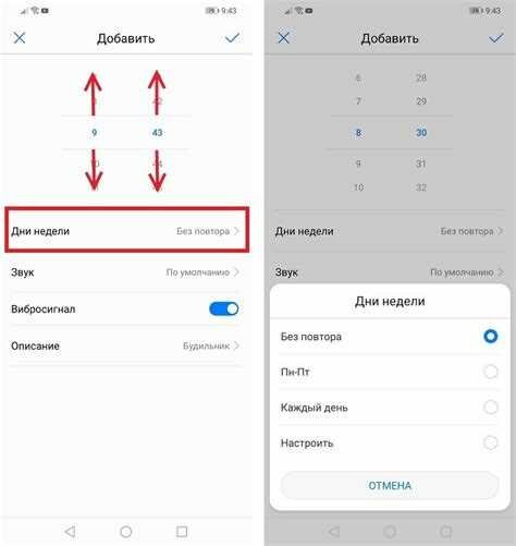 После выбора времени можете настроить дополнительные параметры, такие как дни недели, когда будильник будет звучать. Это удобно, если вам нужно, чтобы сигнал вспоминал о себе только в рабочие дни или же каждое утро. Также можете задать настройки для повторения, если планируете использовать будильник регулярно.