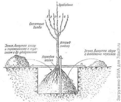 | 3. Установите саженец яблони в яму так, чтобы корни полностью поместились в яму. |
